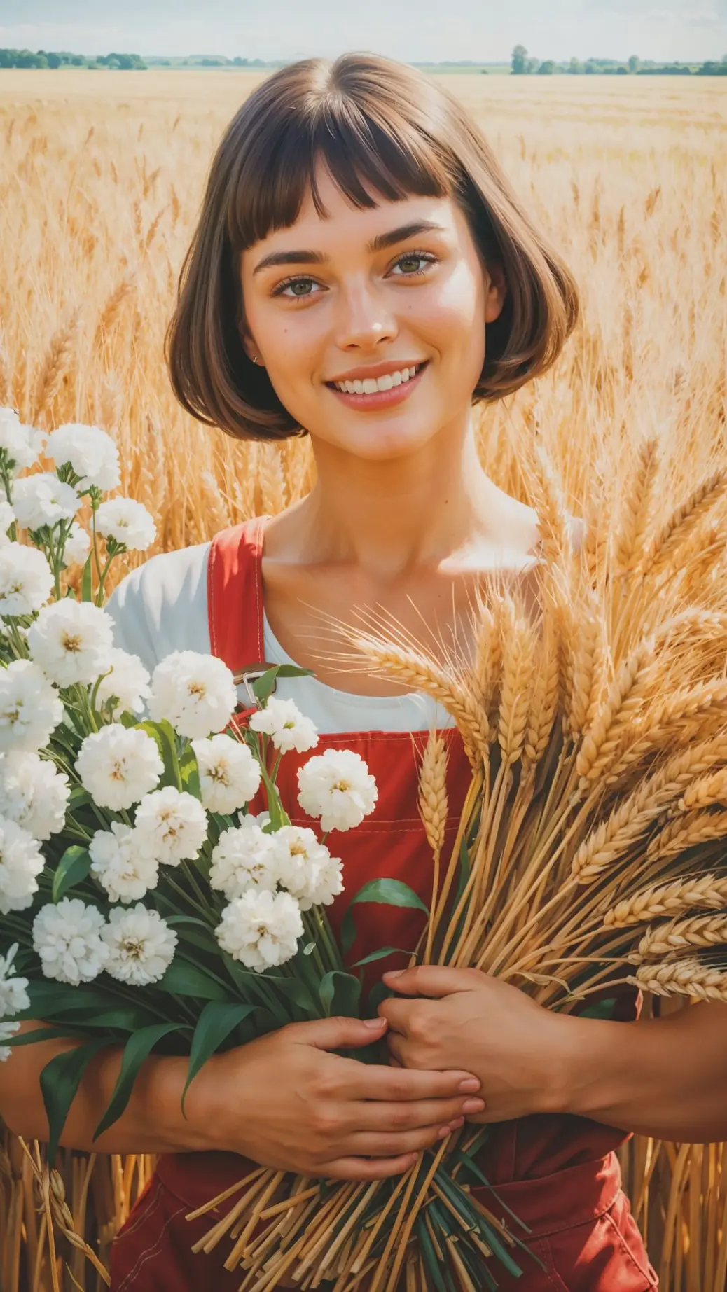 The wheat field stretched endlessly, a golden ocean swaying beneath the October sky. She stood at its heart, a figure in red and white, holding two offerings: a bouquet of white blossoms in one hand, a bundle of wheat in the other.