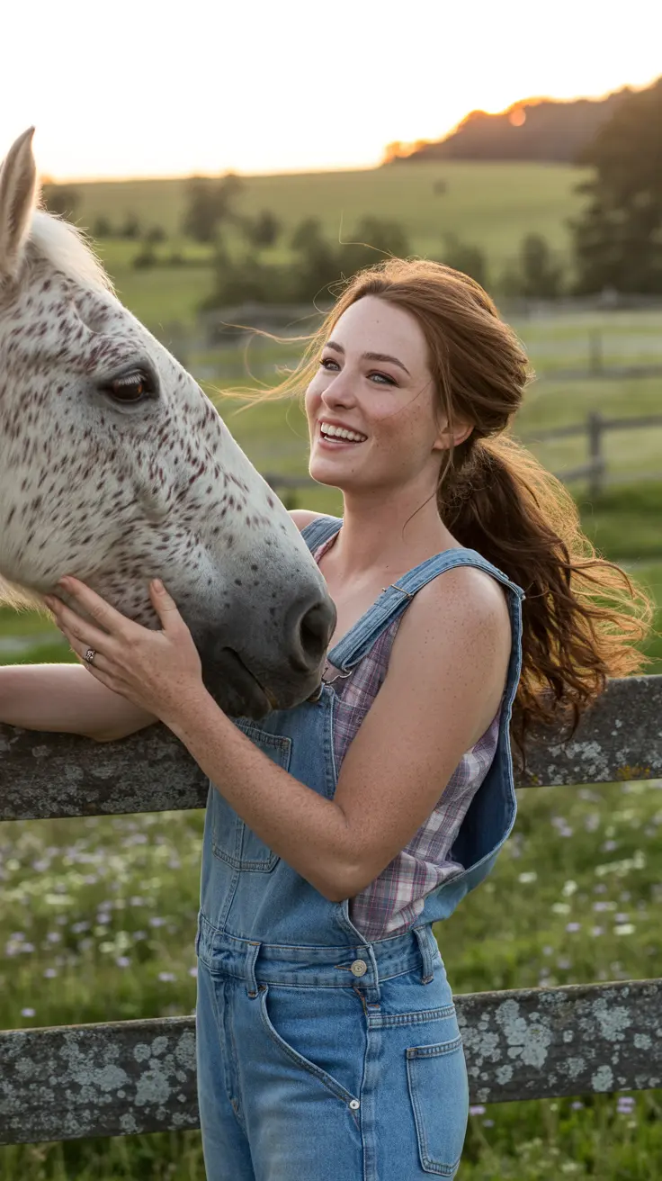 In the quiet glow of a countryside sunset, a woman rests her hand gently against the speckled face of her horse. The world around them hums with the soft rustle of grass and the golden shimmer of wildflowers, but in this moment, there is only stillness—an unspoken dialogue between two beings who have chosen to trust one another.
